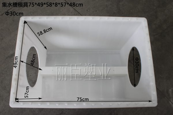 此款產品為客戶定制水泥集水槽模具,使用全新聚丙烯塑料原料,其中集水槽模具長度為75厘米,寬度為49厘米,深度積水區高度為57厘米,稍淺積水區為58.8厘米,實際高度深淺主要取決于預制水泥集水槽成品,具體詳細尺寸可參考下圖: