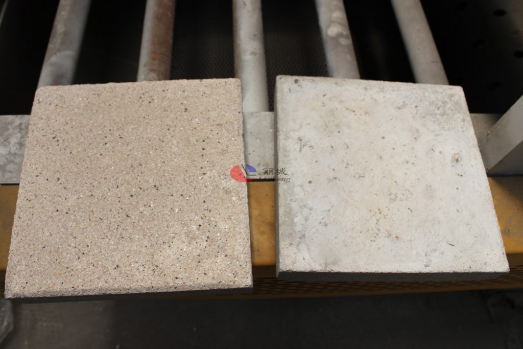 1.先使用塑料模具來澆筑成型的混凝土彩磚,對于預制成型的混凝土彩磚進行模具的脫模,放置一旁得以備用,下面這張圖是主要能更清楚的看出使用混凝土路面拋丸機后的水泥磚表面。