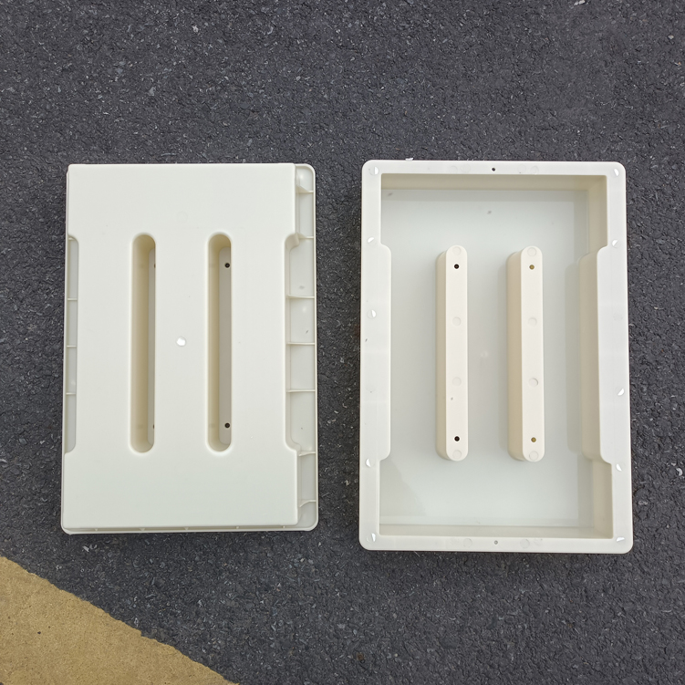 模具整體材質采用強度較高的淺黃色ABS材質制成、模具帶缺口二孔,大體尺寸為50cm*31.5cm*7cm,具體尺寸如下設計圖,模具材質強度高,可以重復使用多次,擁有缺口的設計可以使雨水流通量更大,更不容易造成堵塞。