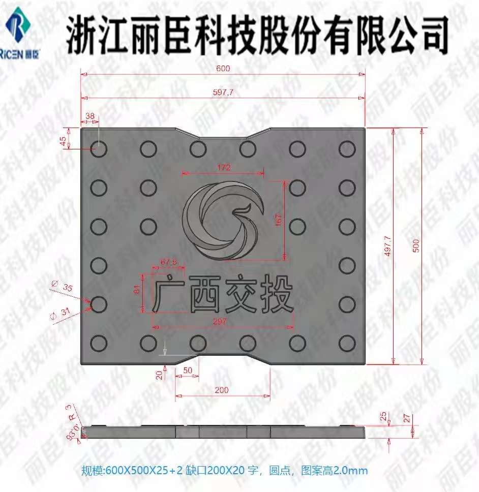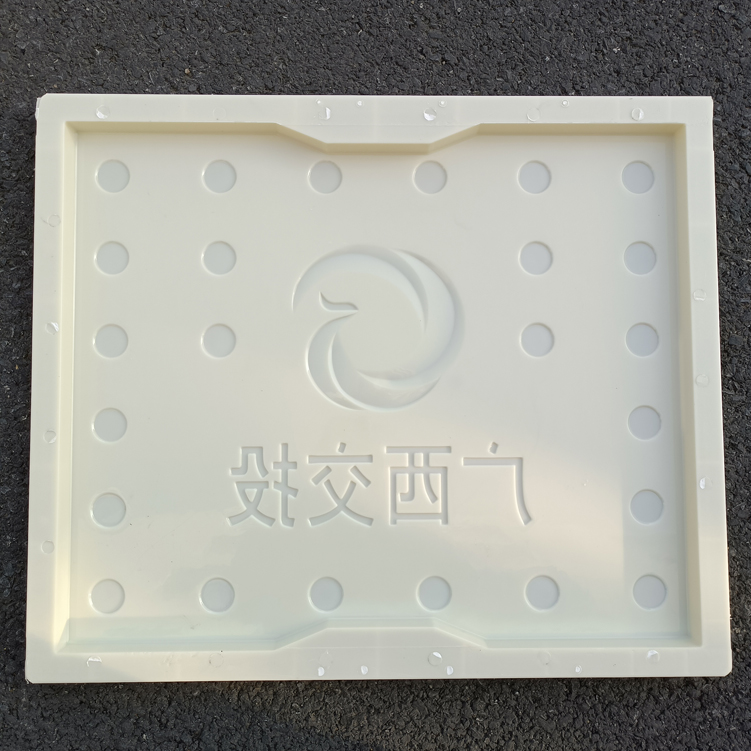模具主要用于廣西高速,模具擁有三個尺寸:80x50x2.5、75x50x2.5、60x50x2.5,模具整體都采用ABS材質制成,模具板面為缺口圓點,帶廣西交通投資集團標志,底部有“廣西交投”四字,模具尺寸薄,主要用于RPC材質的預制成型。