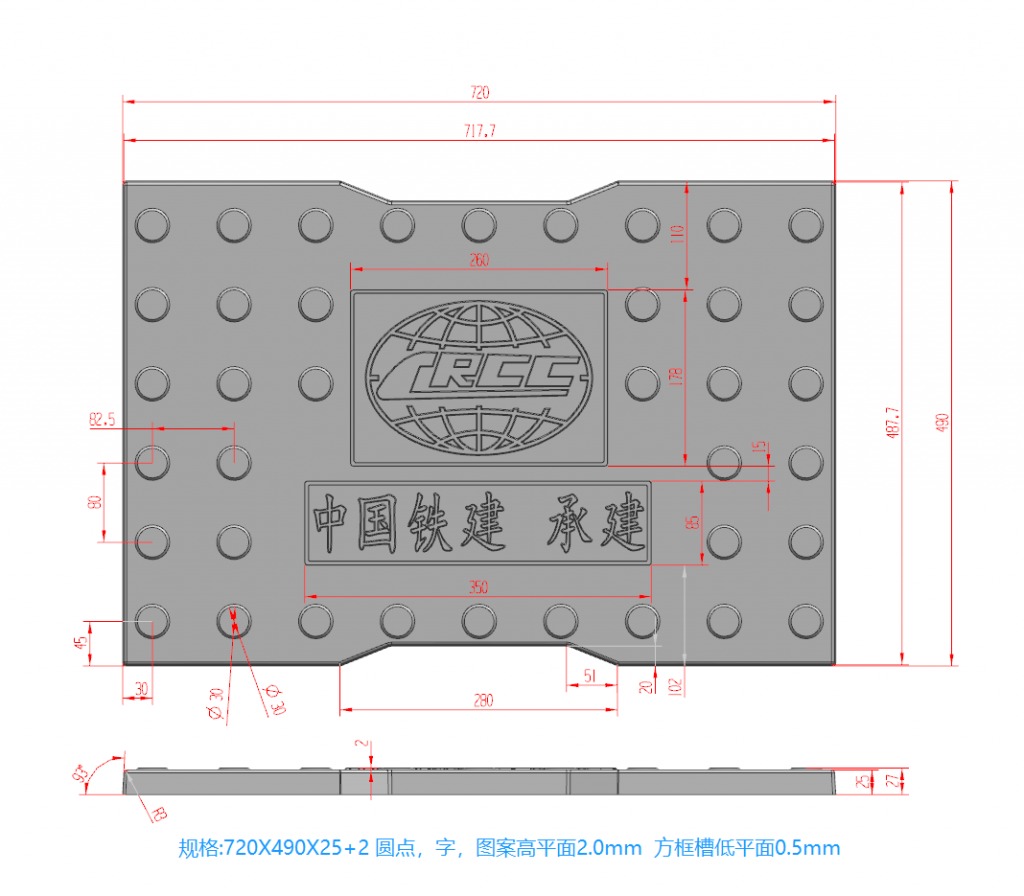 模具較薄,主要用于rpc材質(zhì)預(yù)制制作,花紋為缺口圓點(diǎn),中間帶有中鐵圖標(biāo),底部設(shè)有中國鐵建 承建字樣,為中鐵專用模具。